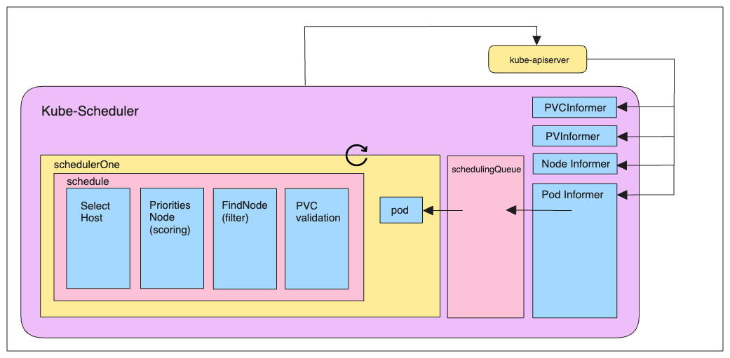 kube-schedulerLe kube-scheduler est le composant responsable d'assigner les pods aux nœuds "worker" du cluster. Il choisit alors selon les contraintes qui lui sont imposées un nœud sur lequel les pods peuvent être démarrés et exécutés.